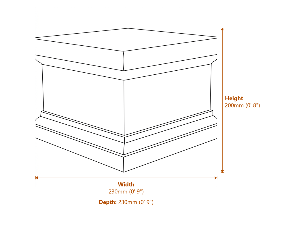 The wide 230mm square base and matching cap sit flat on any level surface. This plinth needs no maintenance. Simply position it and leave it outdoors through every season. The marble-resin material will not crack, flake, or discolour in frost, rain, or direct sunlight.