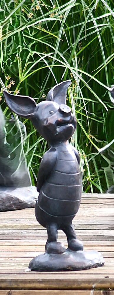A charming set of five Winnie the Pooh resin garden ornaments in aged verde bronzed patina, standing 230mm to 440mm tall.