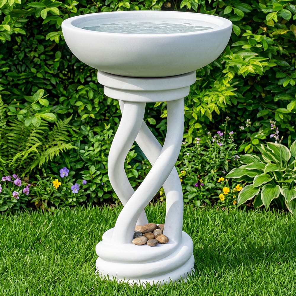 A 70cm hand-finished white stone bird bath with sculptural spiral columns and a frost-resistant finish