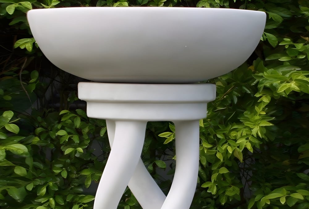Interlocking spiral columns form the base, giving the piece a distinctive silhouette. It works equally well as a garden centrepiece or a statement piece indoors. Each bird bath is hand-finished by Enigma, a specialist in cast stone garden ornaments.