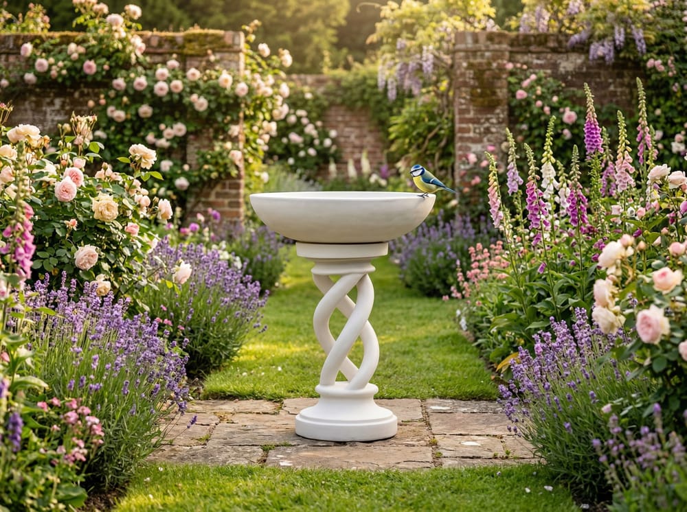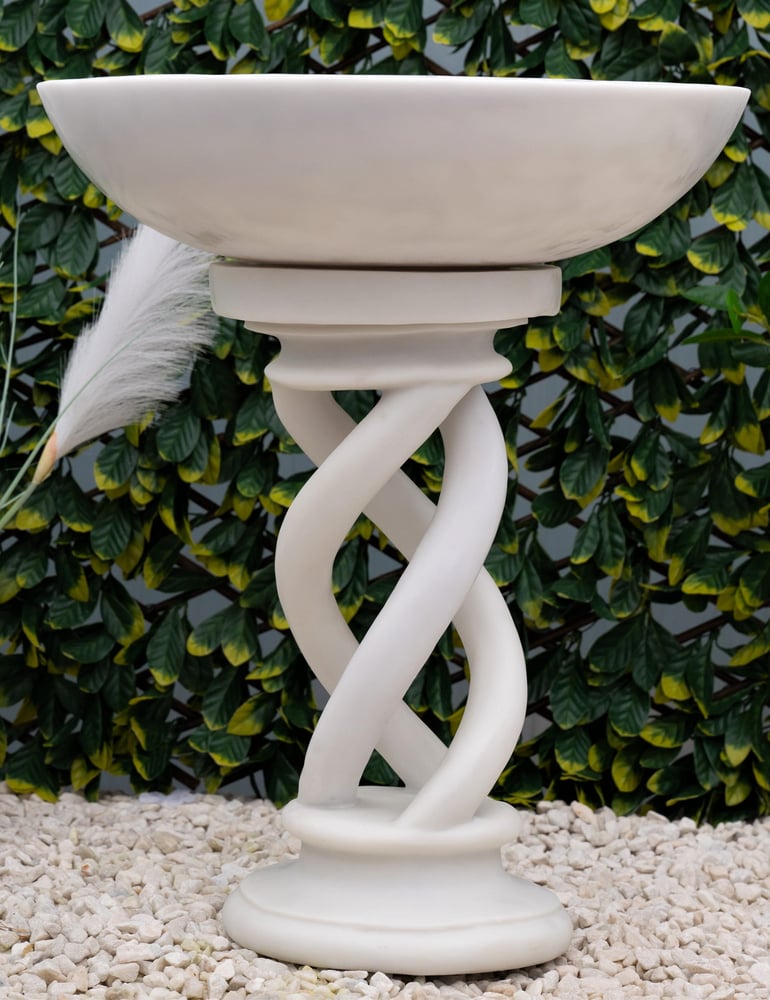 A hand-cast white spiral birdbath in crushed marble and resin, frost-proof and ready for year-round garden display