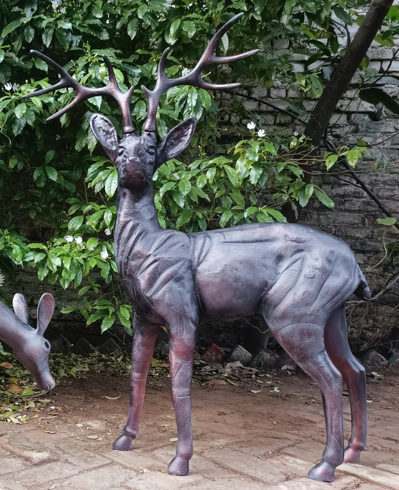 The stag stands a proud 120cm tall with a full set of antlers. The doe sits alongside at 87cm long and 63cm high. Both are cast in aluminium with an aged bronzed patina applied by hand.