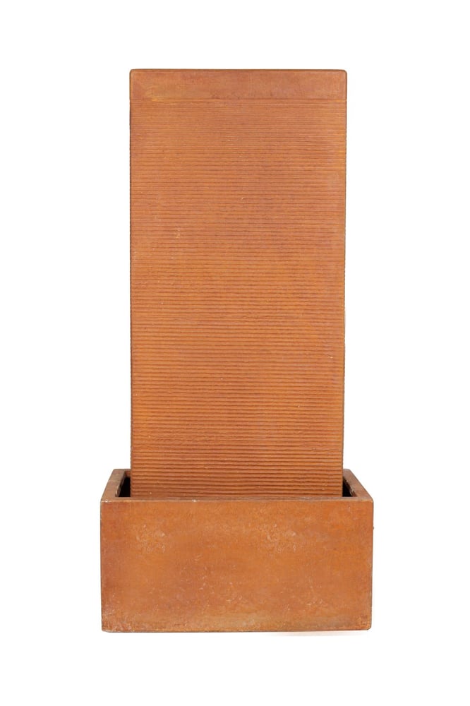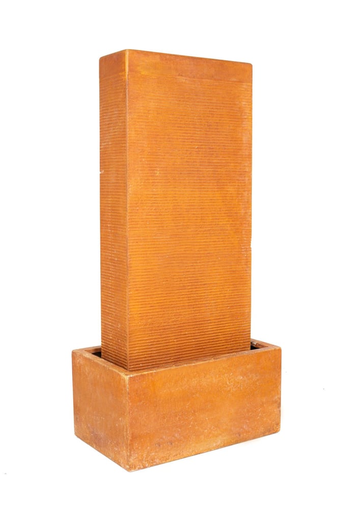 A 1030mm contemporary water feature with oxidised bronze-effect finish and gentle ribbed cascade