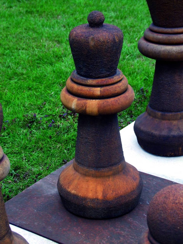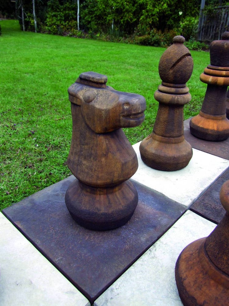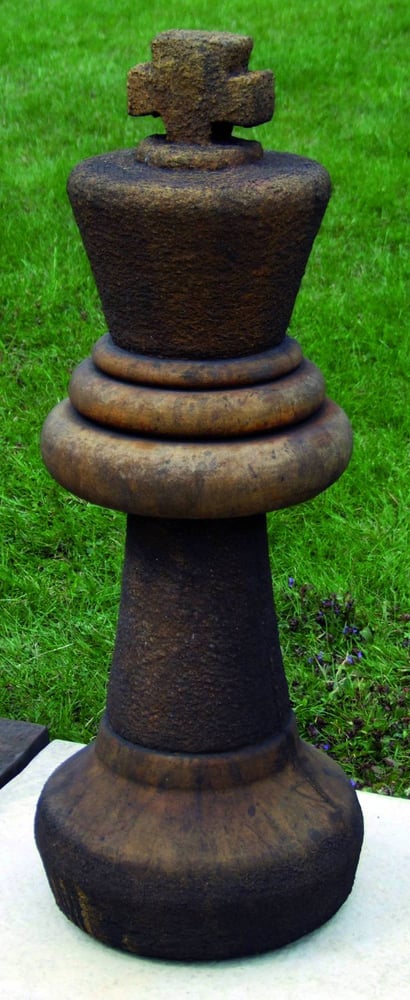 Each of the 32 chess pieces is hand-moulded by Lucas Stone, a small family-run workshop based in the UK. They use local materials and traditional casting techniques perfected over decades. The pieces stand between 400mm and 600mm tall in contrasting rust and sandstone finishes.