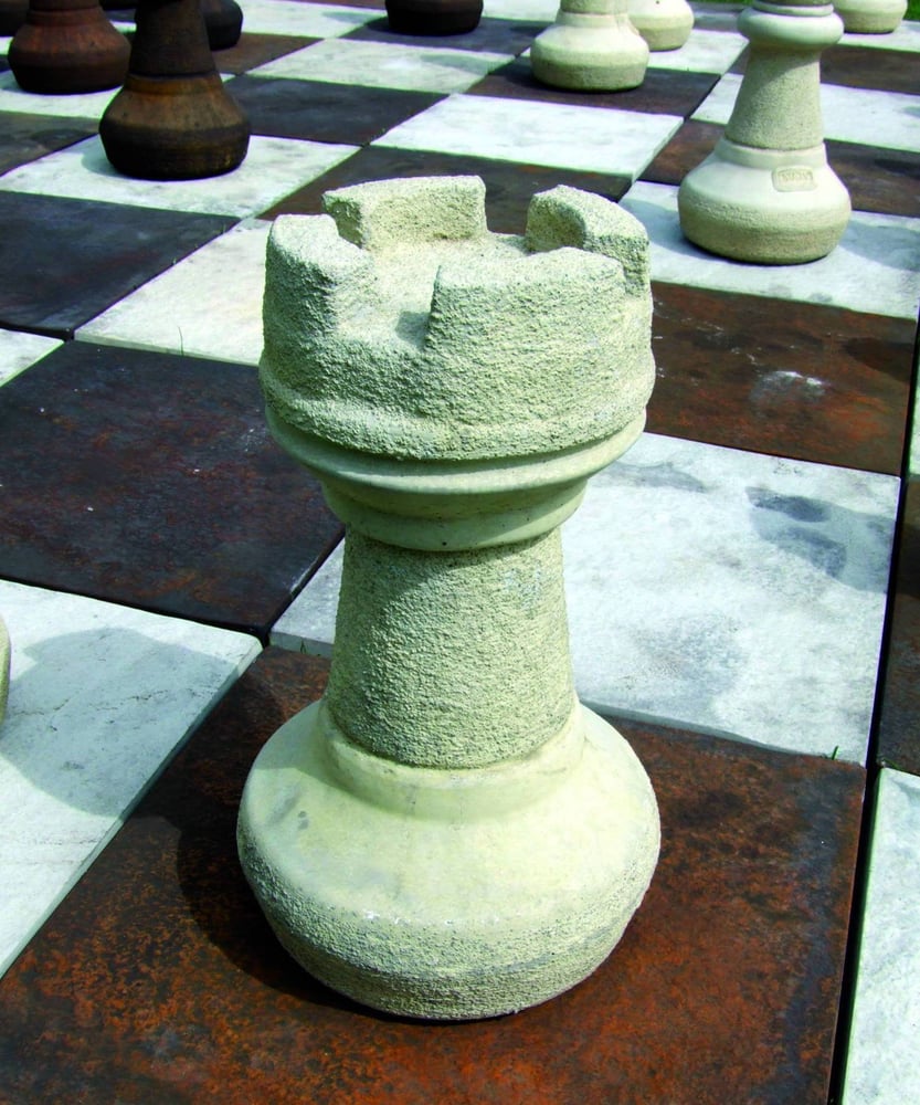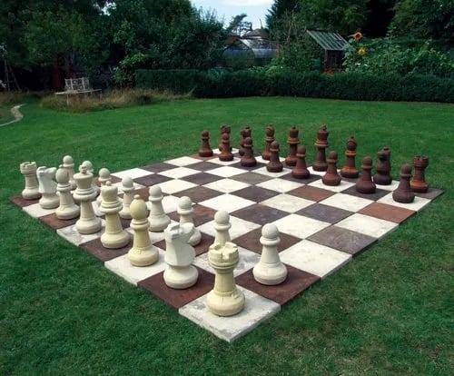 The matching stone board uses alternating rust and sandstone tiles to create the classic chessboard pattern. At 3.6m square, it provides generous spacing between pieces. This makes it easy to walk around the board during play.