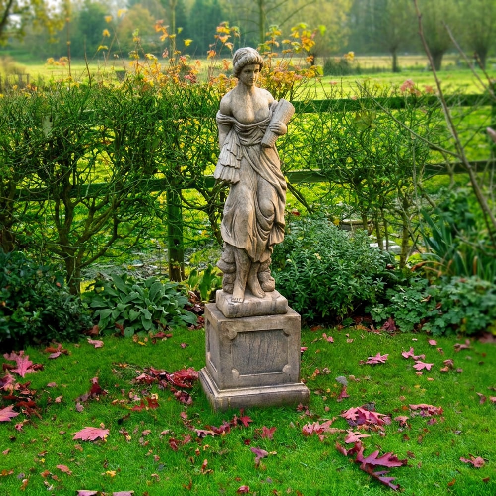 This classical stone figure depicts a maiden carrying the first fruits of summer. She stands on an integrated plinth base with flowing robes and finely detailed features. At 116cm tall and 81kg, the statue has genuine presence in any garden setting.