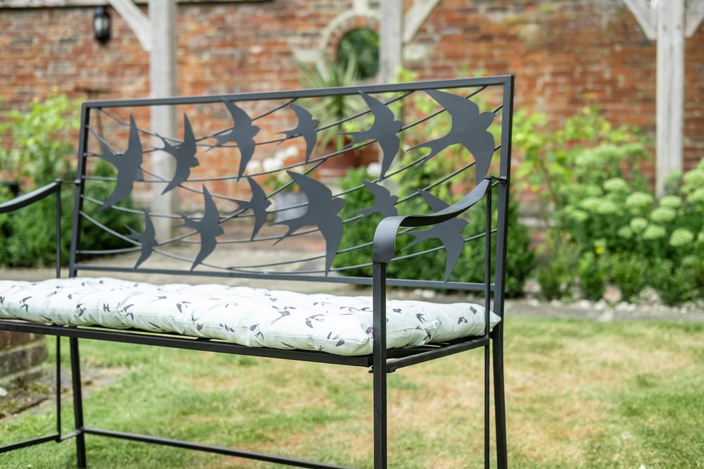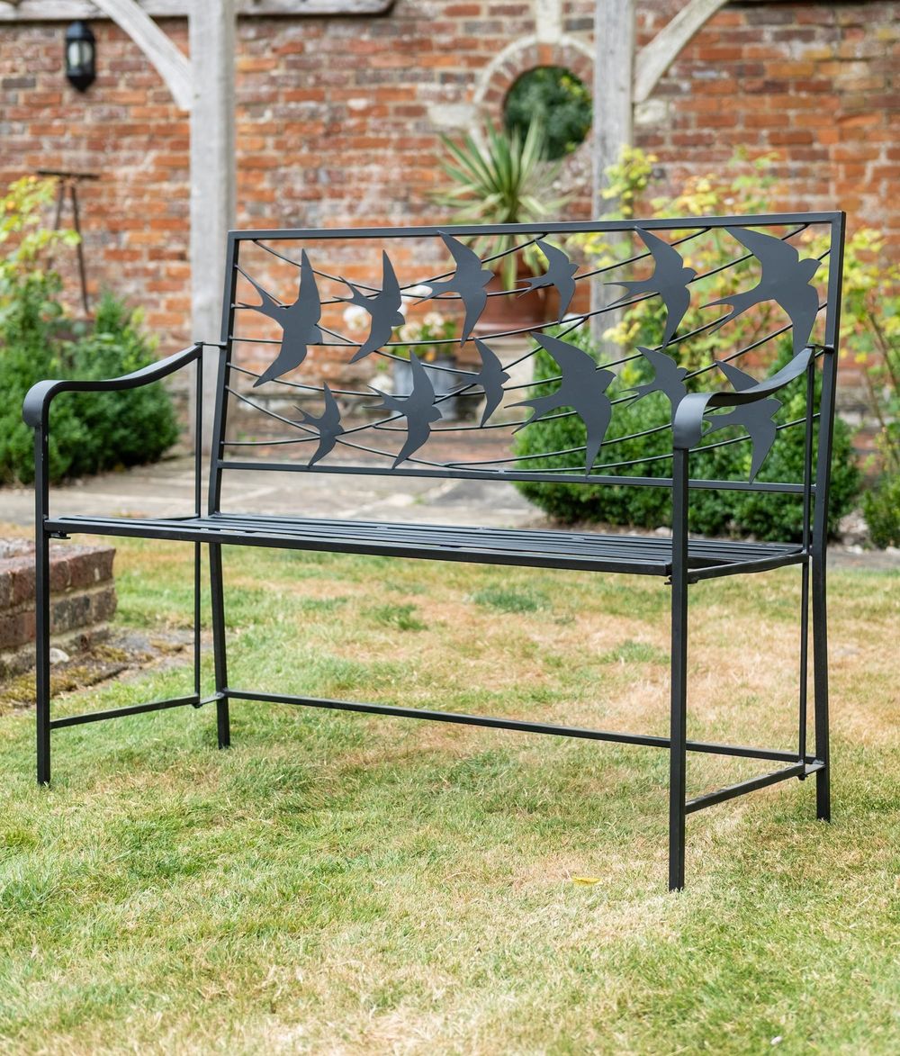 Transform your outdoor space with the captivating elegance of the Swallow Black Metal Garden Bench. Measuring 115cm wide, this bench features durable powder-coated black steel, designed to withstand all weather conditions. The intricate laser-cut detailing on the seat back, depicting graceful swallows in flight, creates a stunning visual centrepiece for any garden.