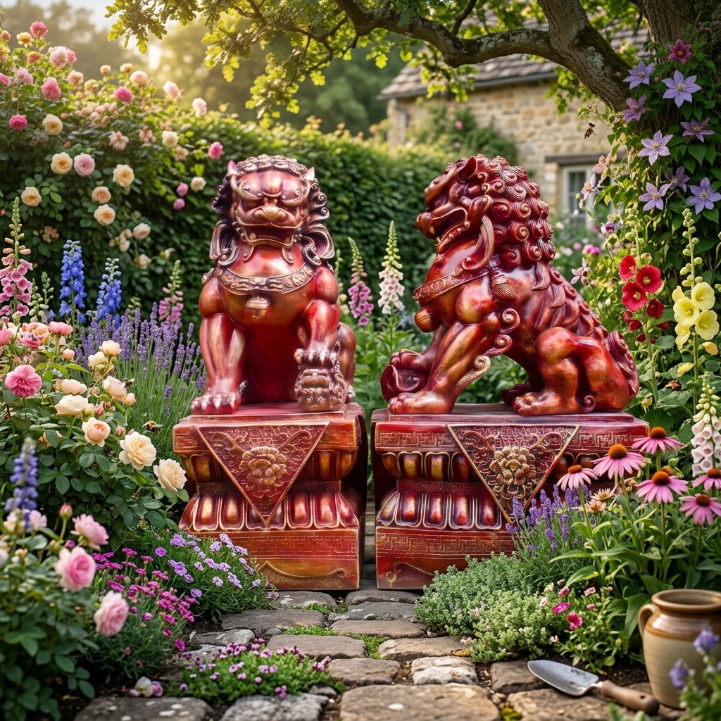 Temple dogs are traditional guardian figures in Eastern culture, often placed at entrances to ward off negative energy. This pair brings that symbolic presence to a British garden setting with a finish that stands out against green foliage and natural stone.