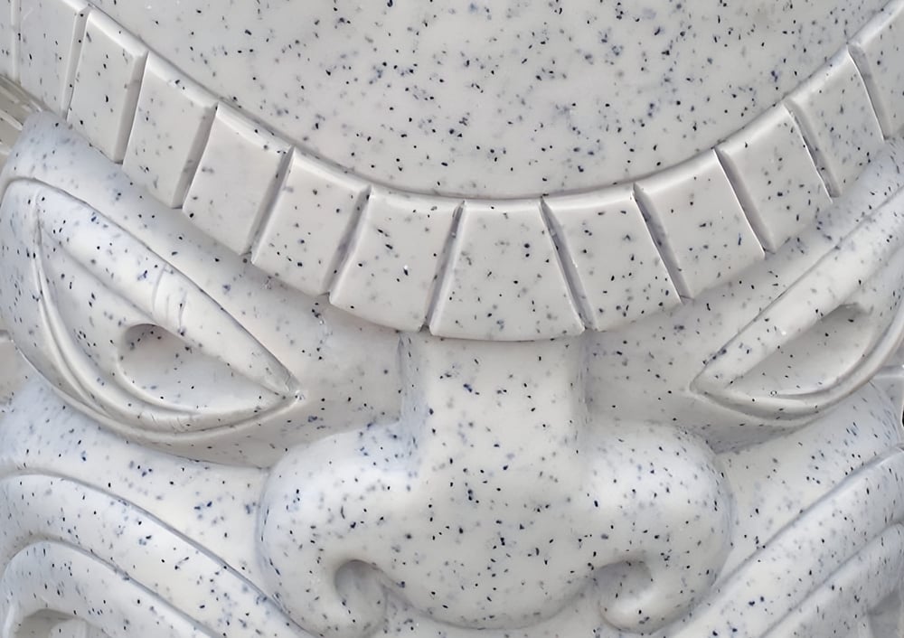 A 40cm Polynesian-inspired stone planter in speckled granite, frost-resistant for year-round garden display
