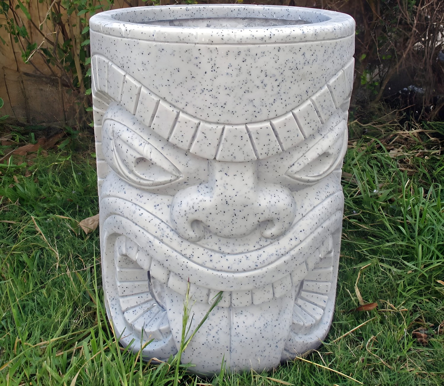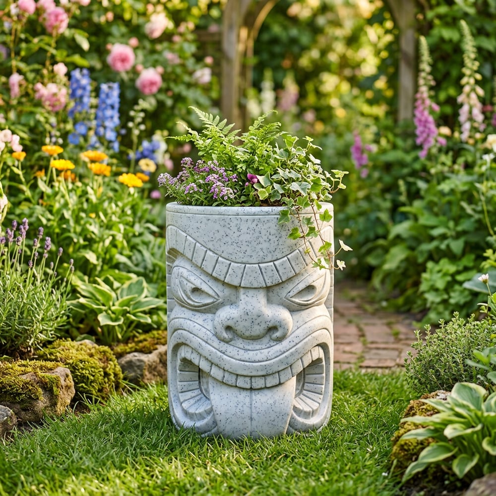 The Tiki Head Garden Planter in Granite stands 400mm tall. It brings Polynesian-inspired character to any patio, border, or indoor space.