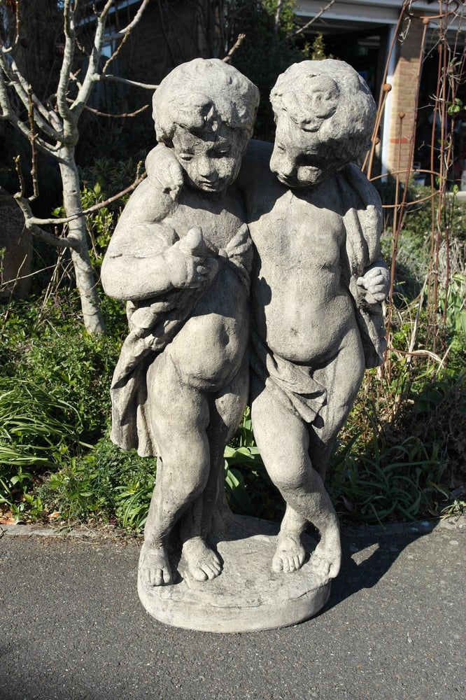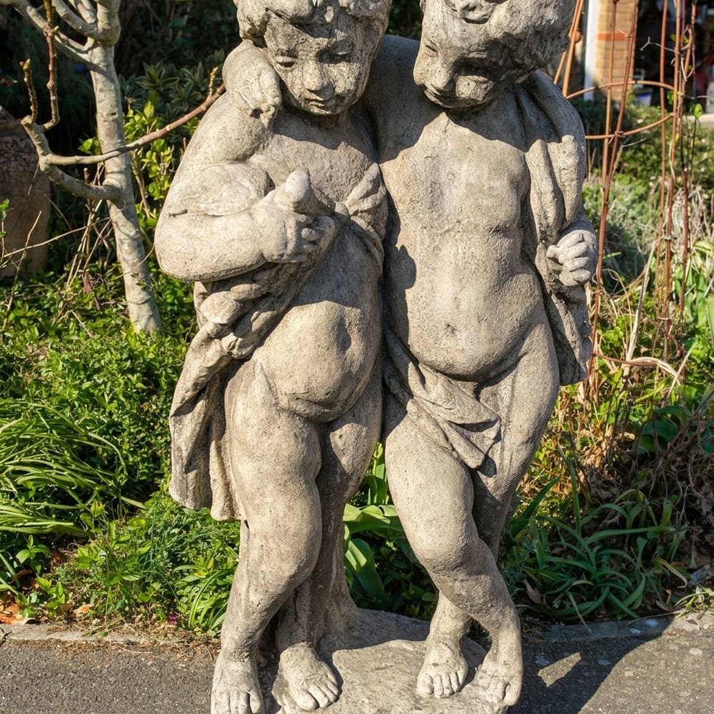The Twin Standing Cherub Stone Statue depicts two classical cherubs walking side by side. At over one metre tall and weighing 136kg, it makes a permanent garden feature.