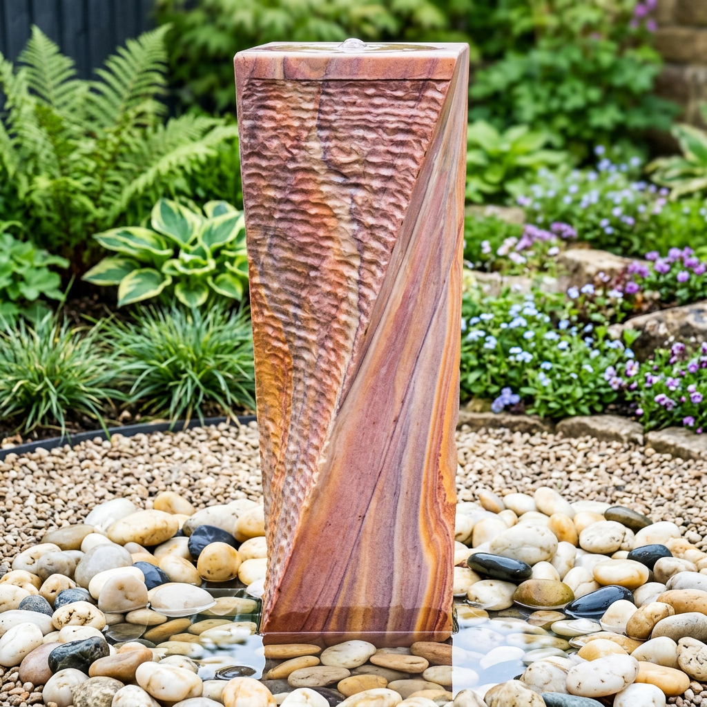 The Twisted Chills Rainbow Sandstone Water Feature Large stands 900mm tall. It is carved from genuine rainbow sandstone with a distinctive twisted column shape.