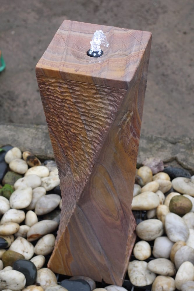 The Twisted Chills Rainbow Sandstone Water Feature Small brings natural movement to your outdoor space. Standing 65cm tall, the column features two smooth polished sides and two raw saw-cut faces. Water ripples differently across each texture, creating a changing display throughout the day.