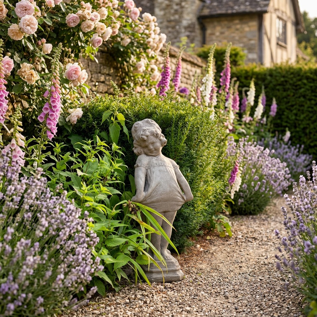This Victorian Girl Garden Statue captures the charm of a young girl mid-curtsy, perfect beside a garden path or cottage border.