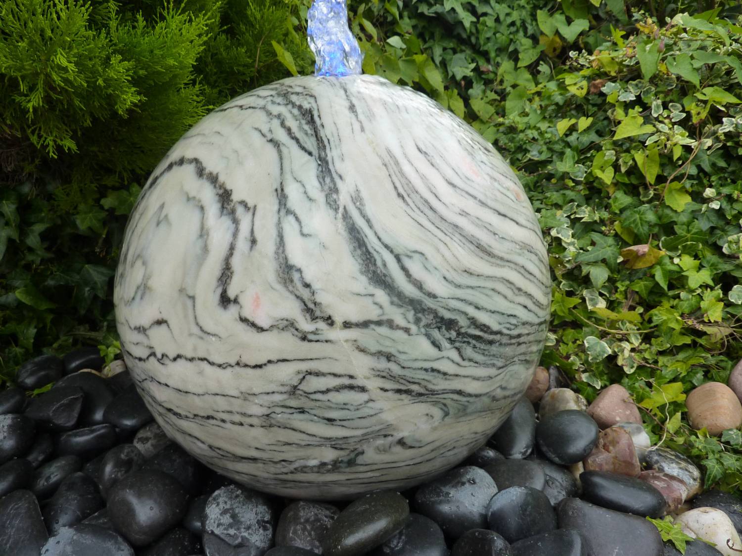 The Wave Polished Granite Sphere Water Feature has a beautiful smooth globe design with marble accenting that would add an air of calm to any garden.