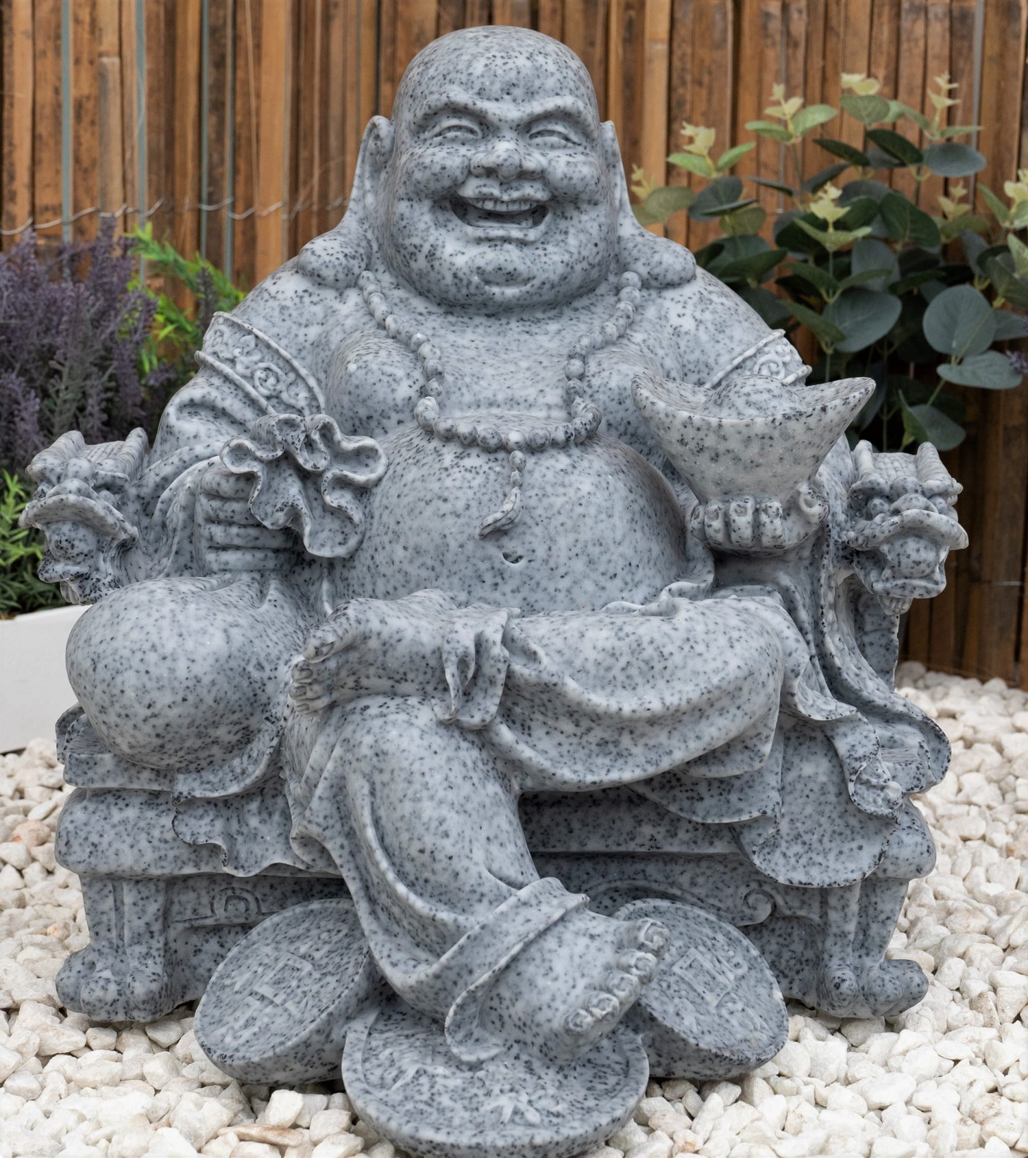 Depicted seated in a relaxed pose, this laughing Wealthy Sitting Buddha Gaden Ornaments is inspired by Pu-Tai, also known as Hotei, a traditional symbol of plenitude and fulfilment. Representing abundance in wealth, happiness, and satisfaction, this beautifully sculpted figure is crafted from premium Grey terrazzo marble and faithfully captures the artistâs original vision with crisp, expressive detail. Strong, durable, and suitable for year-round display, it offers a meaningful way to invite prosperity, positivity, and contentment into everyday life.