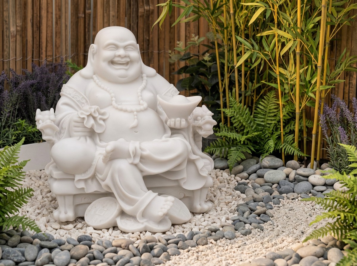 The Wealthy Sitting Buddha in White is a hand-cast terrazzo marble statue depicting Pu-Tai (Hotei), the laughing Buddha of abundance. At 38cm high and 18kg, this frost-proof ornament suits patios, borders, and indoor displays year-round.