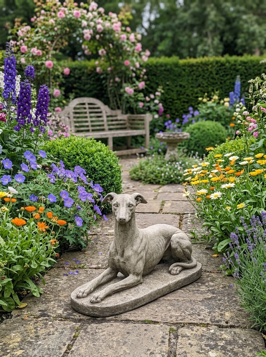 Handcrafted 410mm cast stone Whippet statue in Aged Cotswold or Burnt Umber, with free UK delivery